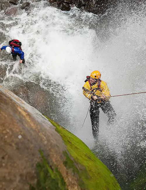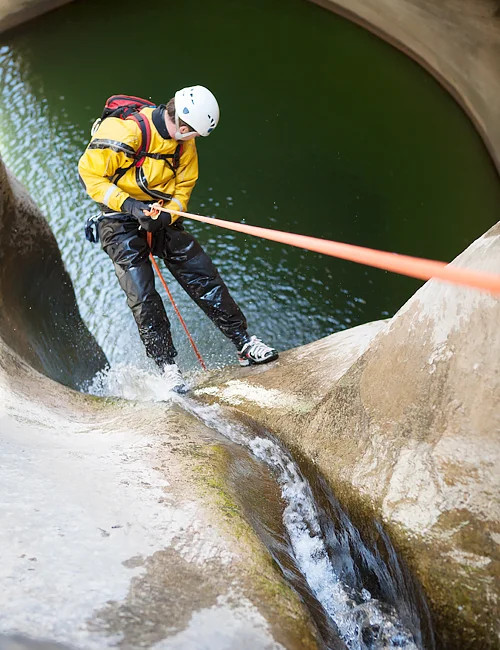 Rappelling with a guiding line during and Instructional Canyoneering Course.