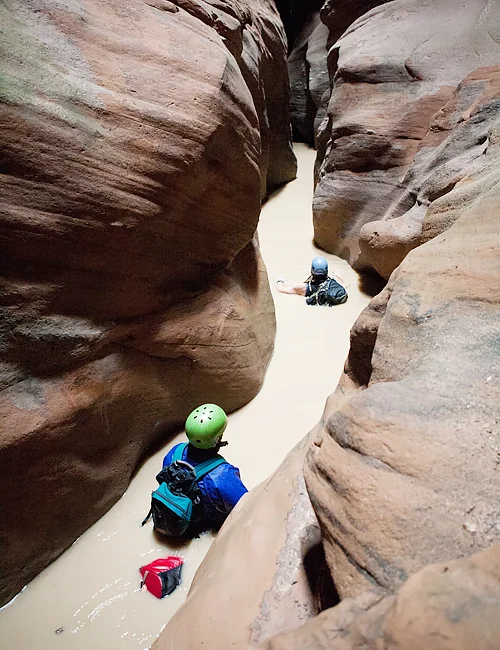 Stemming in a slot canyon on a guided canyoneering trip to Yankee Doodle.